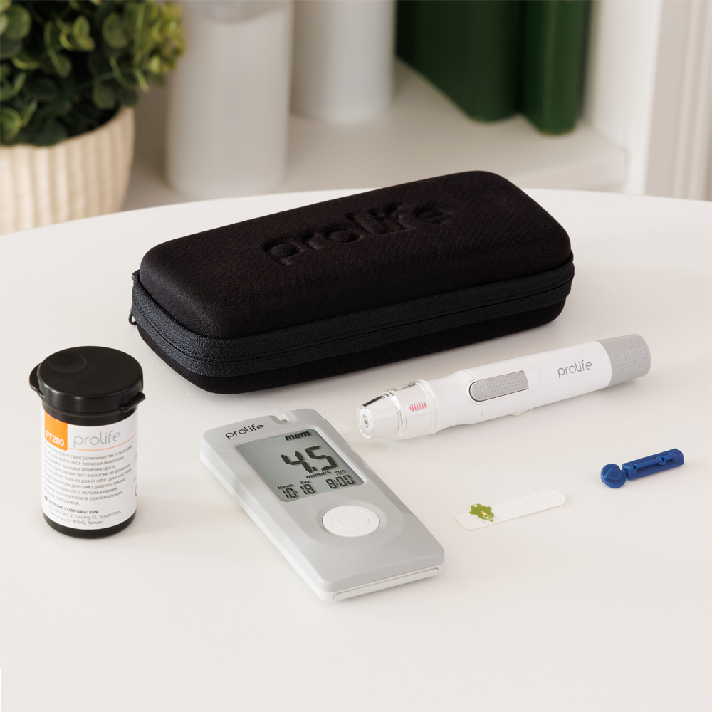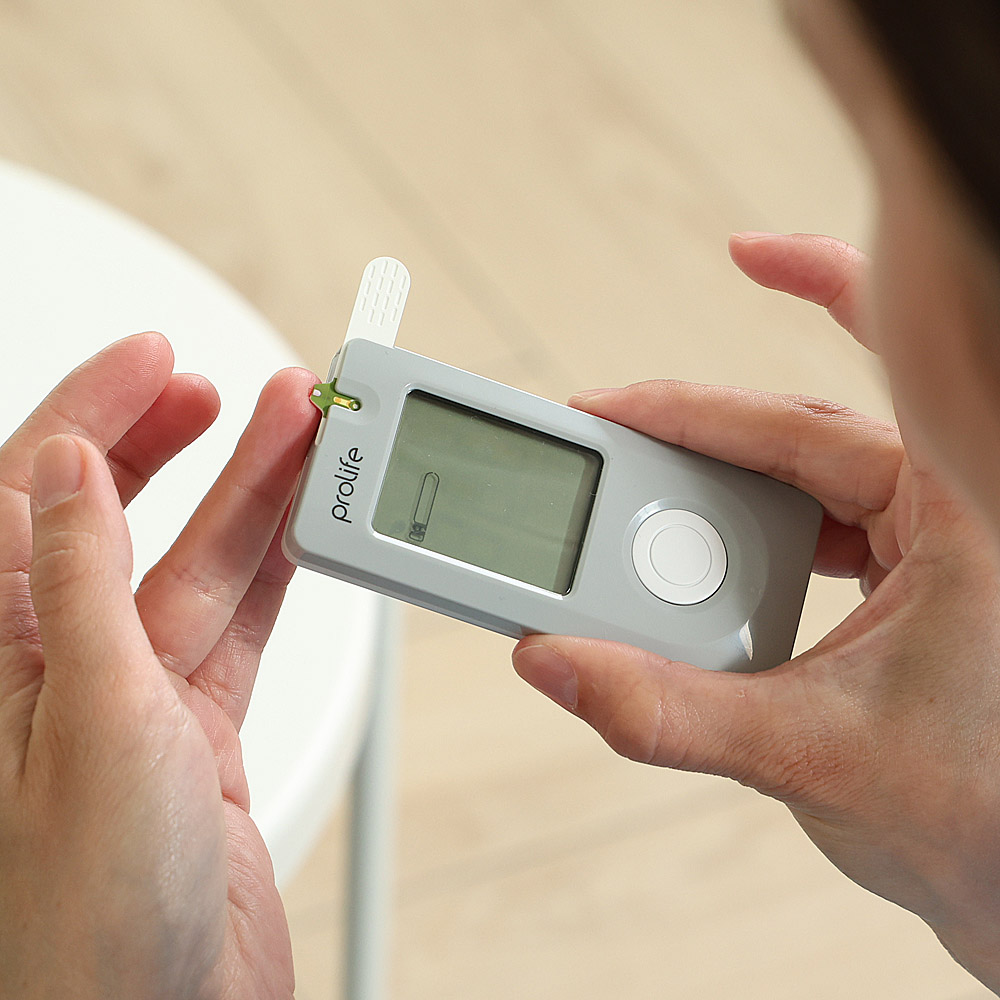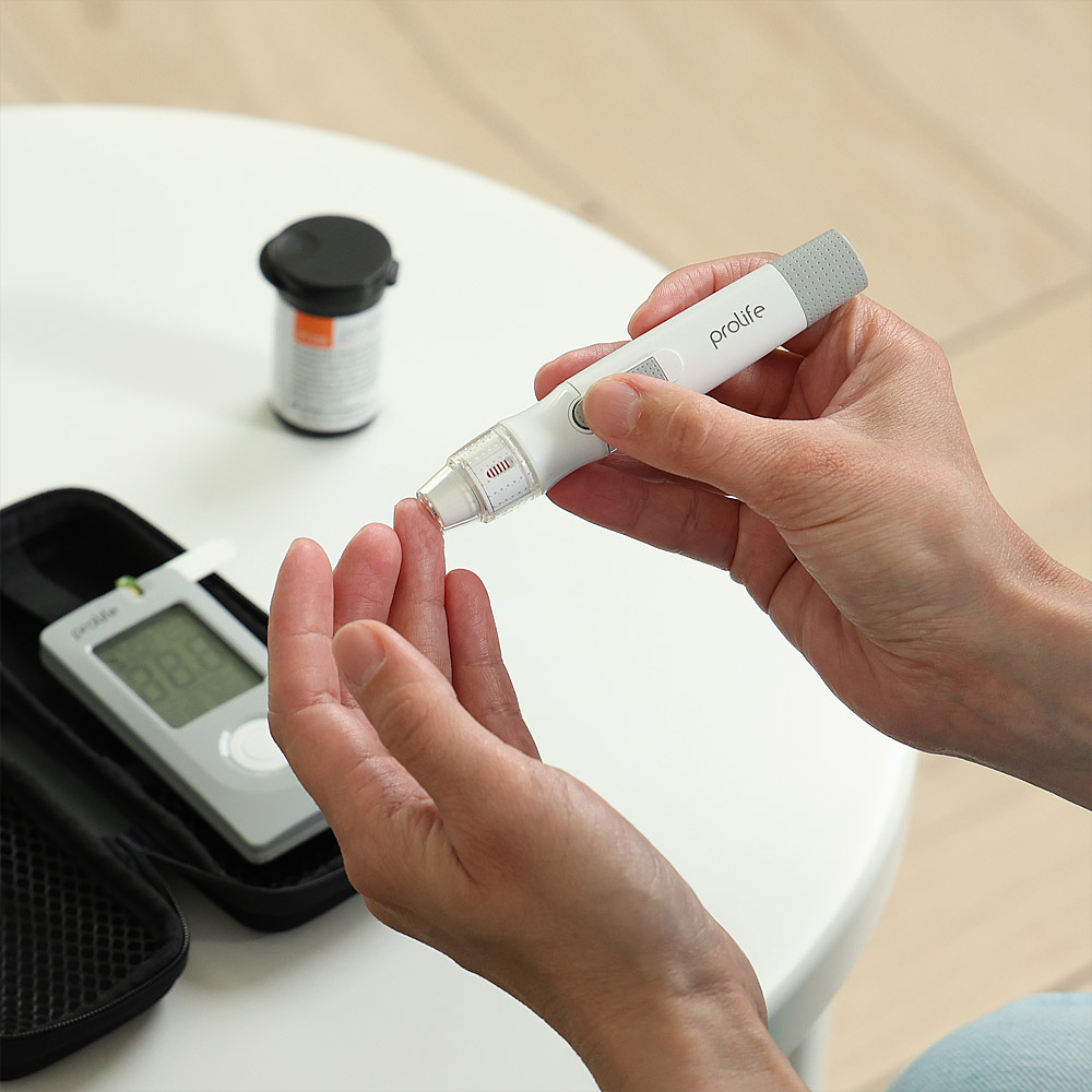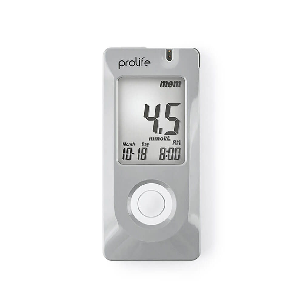 Eine schonende Punktion, ein minimaler Blutstropfen (0,75 µl) – und in 5 Sekunden zeigt das Blutzuckermessgerät Prolife PM200 den Blutzuckerspiegel an. Das Gerät liefert ein präzises Ergebnis, das den in Labor gemessenen Werten ähnlich ist. Das Blutzuckermessgerät speichert 500 Ergebnisse mit der Datum- und Uhrzeitanzeige. Es erfordert keine vorherige Codierung.