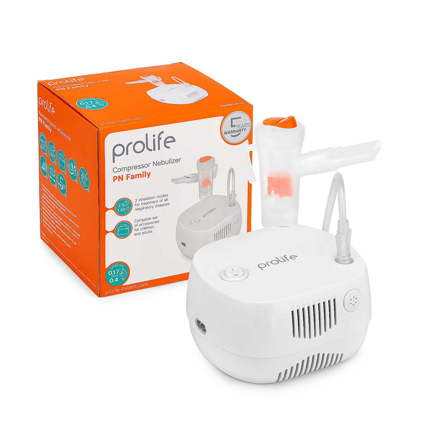 | Lieferumfang | Kompressor (Netzteil), Vernebler-Satz, Schlauch (1.5 m), Mundstück, Nasenteil, Maske für Kinder, Maske für Erwachsene, 5 ersatzbare Filt, Netzkabel, Bedienungsanleitung, Garantiekarte, Prolife-Tasche |